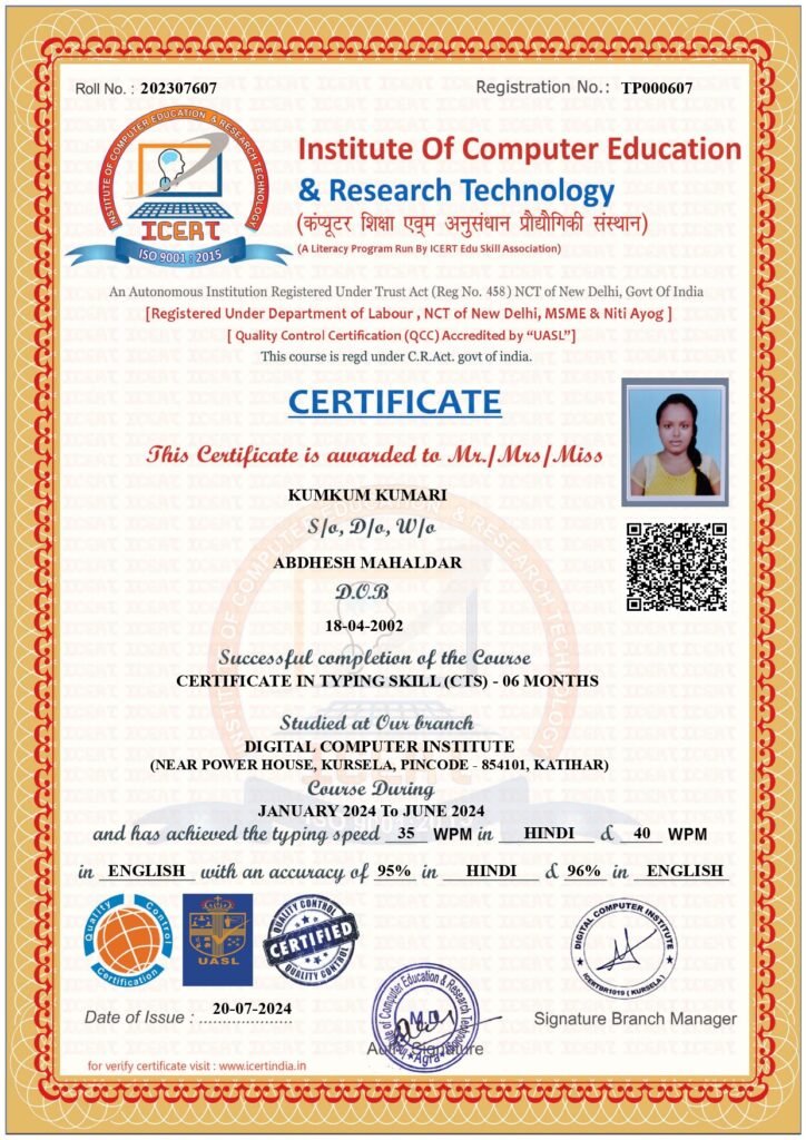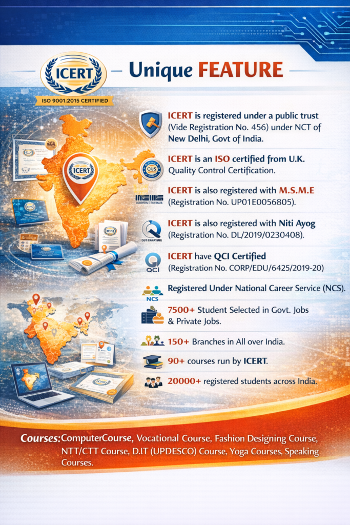 ICERT (Institute of Computer Education & Research Technology) is a leading organization dedicated to promoting digital literacy and professional computer education across India. The institution aims to empower youth with modern computer skills so they can succeed in the digital era.
